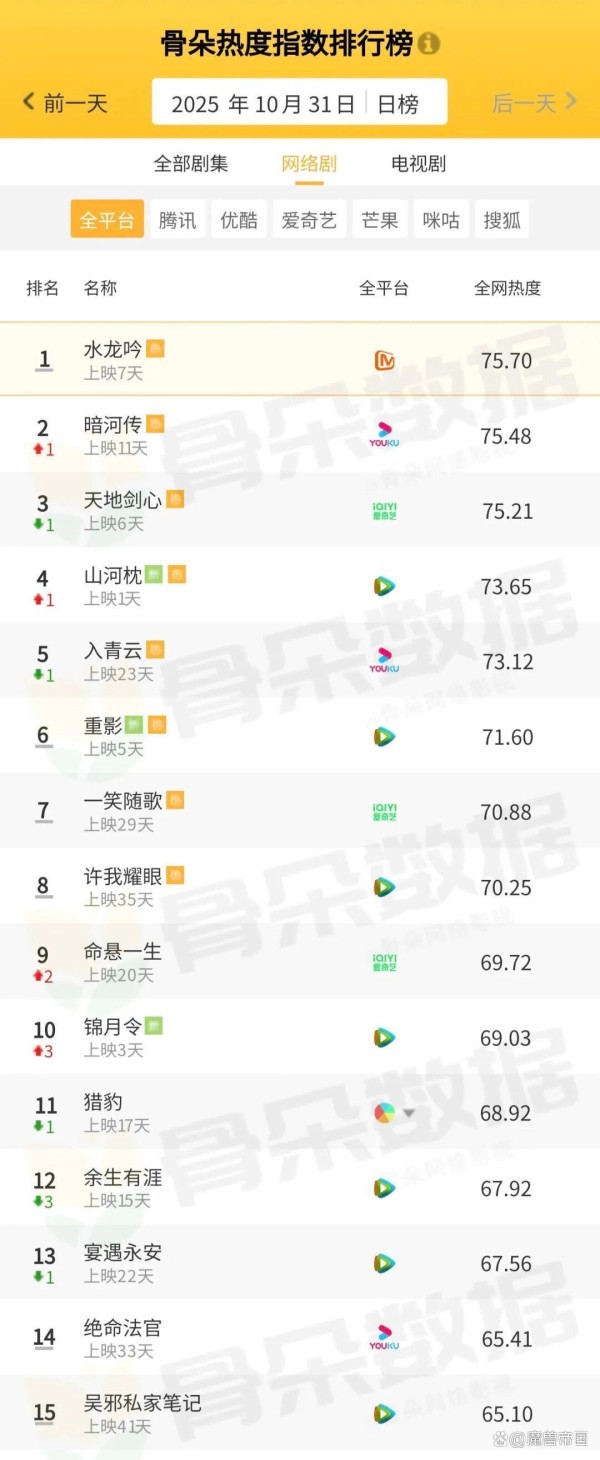你有没有发现,当下的娱乐圈就像一个巨大的“流量引力场”,无论是电视剧还是综艺节目,稍不留神,观众的视线就被抓得紧紧的,无法挪开。骨朵网络影视的最新热度榜单可谓娱乐圈的一把“照妖镜”,不管是常年霸榜的流量之王,还是暗搓搓发力的新生代,都能一目了然。真的,不管你是剧粉、综艺铁粉,还是喜欢追漫,骨朵数据都能给你一份满意的答案。简直是娱乐圈的天气预报般存在,说它“现象级”,一点不为过。