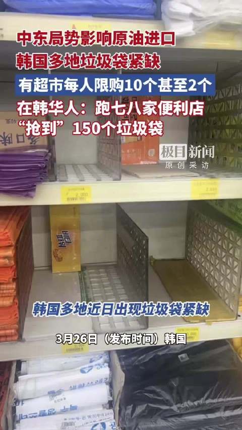 【#韩国垃圾袋一袋难求#,韩国华人:跑遍半个区才买到】#韩国垃圾袋一袋难求多位华人发声#3月25日,不少韩国华人在社交平台发帖称,因中东局势紧张、石油供应短缺,导致韩国多地出现垃圾袋紧缺现象。#在韩华人凌晨跑三家店买不到垃圾袋# 有在首尔的华人网友表示,凌晨跑遍三家便利店均未买到垃圾袋。
