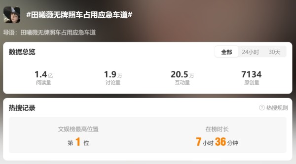 随后,#田曦薇无牌照车占用应急车道#冲上热搜第一。