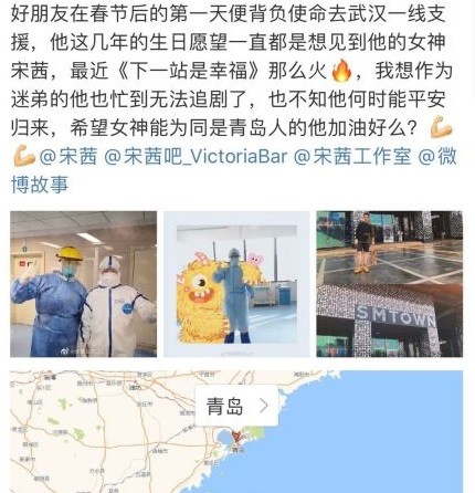 这张照片是一位去往武汉的支援队伍中的一员,他还有另一个身份,就是宋茜的“迷弟”。在去往武汉之前,他的好友说出了他的愿望:“他这几年的生日愿望一直都是相见到他的女神宋茜”,并希望宋茜为他加油。