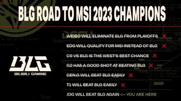 而在MSI的比赛过程中,BLG淘汰韩国队GEN和T1两场尤其精彩。在对战GEN前,前《英雄联盟》人气选手Doinb预测BLG将被1:3大比分淘汰。没想到,BLG以3:0的成绩碾压GEN,打得对手无力招架。这也是LPL赛区(中国区)的战队时隔1084天,再次以3:0战胜LCK赛区(韩国区)的战队。