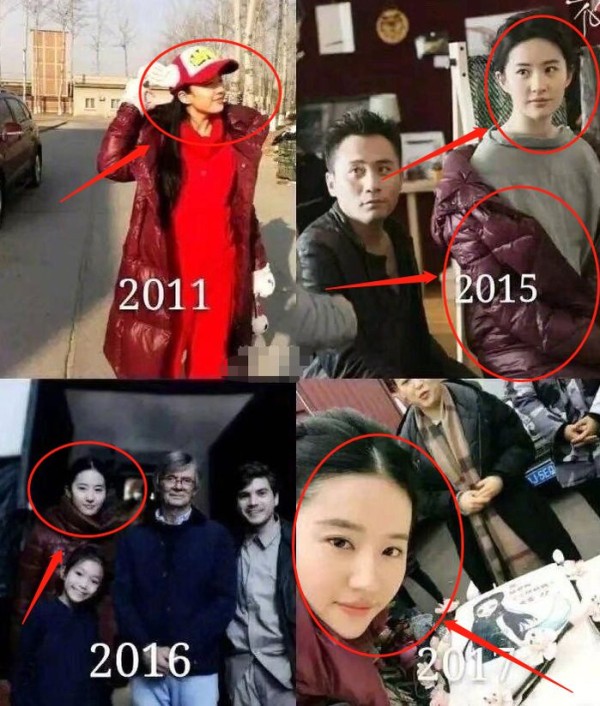 不少网友扒出刘亦菲穿这件羽绒服的照片,原来从2011年开始,这件衣服就已经出镜了,到后来不少的场合中,刘亦菲都有带这件羽绒服。