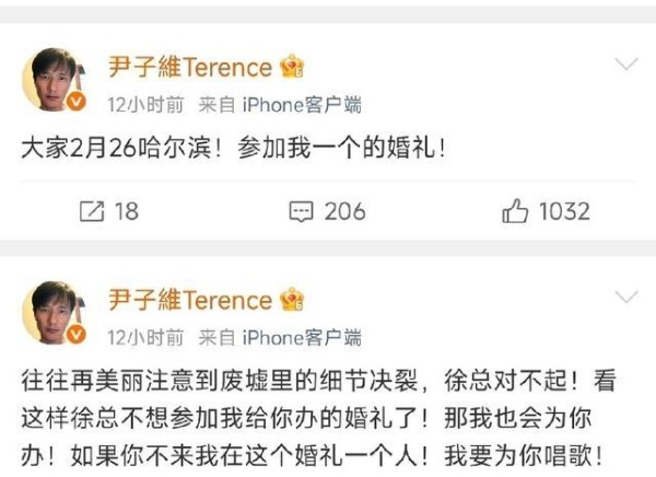 尹子维与徐冬冬关于婚礼的...@顺眼又肃穆的小草的动态