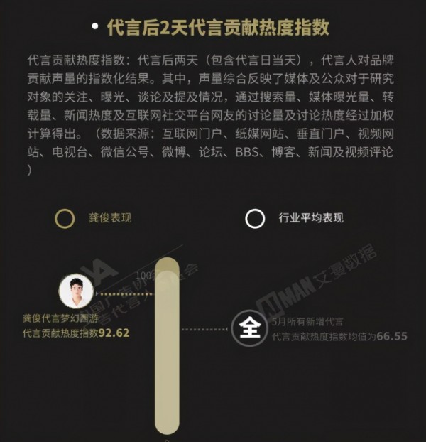 事实上,龚俊与梦幻西游联动后的广告效应确实非常不错。据艾漫数据显示,梦幻西游与龚俊联动官宣后2日,其代言贡献热度指数达到92.62,高于当月所有新增代言贡献热度指数均值的66.55。在艺人热度贡献占比上,龚俊代言梦幻西游热度贡献占比也高于当月所有新增代言达93.58%,品牌声量获取惊人。