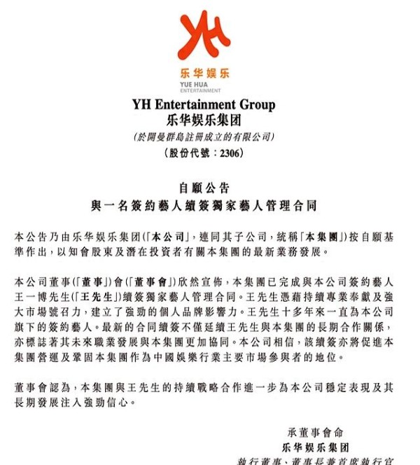王一博与乐华娱乐续约达成,早前获授2500万港元股份