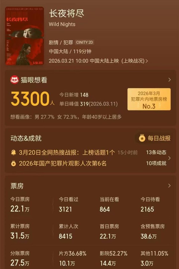 可现实却给了这波热闹一记响亮的耳光。 就在热搜挂着的同一天,《长夜将尽》正式登陆全国院线。 然而,它的首日票房成绩,却连25万元都没能突破。 一顿热搜猛如虎,一看票房原地杵。 这巨大的反差,瞬间成了网友们热议的焦点。