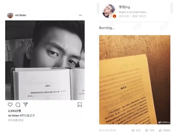 明星带货,粉丝也乐意为偶像代言的商品买单,流量明星的变现能力越强,则说明该明星有商业价值,受到市场认可,曝光率和资源自然会提升。所以,支持明星带货的商品,是粉丝对偶像发展最直接的“爱的鼓励”。有趣的是,今年大热的李现,各类消费品代言都应接不暇,却尤其喜爱在微博和ins上推荐自己读的书,粉丝们很快整理出了“现男友书单”。