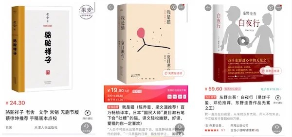小张还看到老舍的《骆驼祥子》,蔡徐坤推荐;夏目漱石的《我是猫》,陈乔恩推荐;东野圭吾的《白夜行》,易烊千玺、邓伦推荐。没想到,买书的过程中,小张又认识了不少明星。