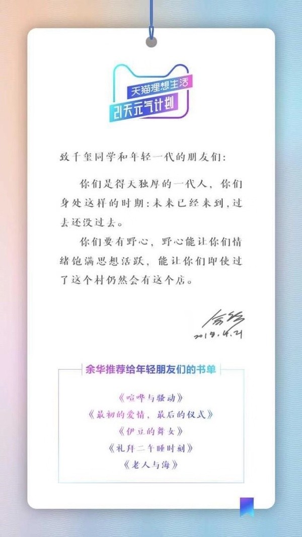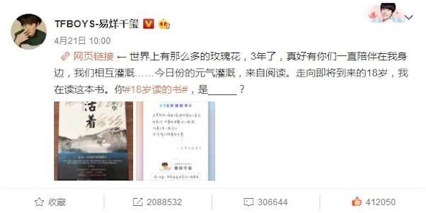可见,明星带货的思路,在书业表现还算不错,书商积极附和,粉丝热情买单。而大多数人对明星荐书也都相对认可,通过明星的流量,为关注度有限的出版行业增加更多曝光,何乐不为。2018年世界读书日活动中,《活着》的作者余华也对易烊千玺的荐书给出了亲切回应。
