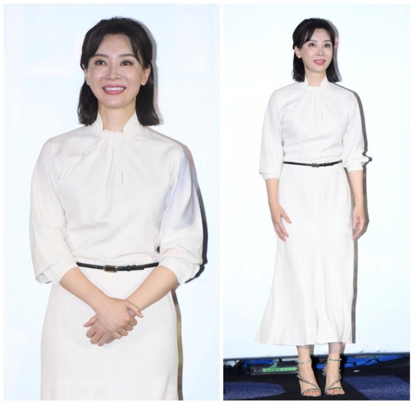 同场的43岁的陈数则一身白色中裙优雅亮相,这是她很擅长的风格,简约大气又得体,但这一套稍稍有些显局促,因为这件上衣的领口比较小,非常裹身,这种有些小高领的设计很考验身材,非常容易显上半身圆润。