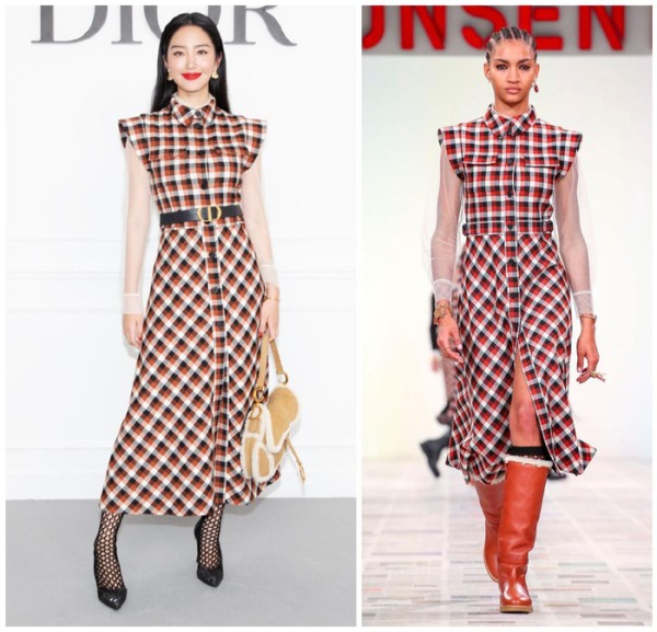 今年秋冬,非常流行这种高领,还有一点小垫肩设计的复古连衣裙,但这种上半身包裹的密不透风的设计,对身材也是一种考验,杨紫的身材在女明星中没有优势,身材比较肉,穿上这件裙子之后,反而凸显了她略显厚重的上半身,和模特对比变失败买家秀。