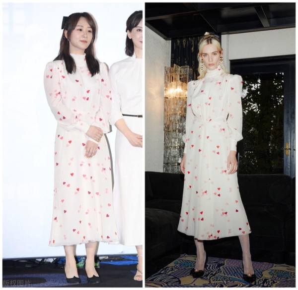 杨紫换了造型团队之后,风格上有了更多的可能,这次她穿了一件Alessandra Rich 2020秋冬系列的复古垫肩高领雪纺连衣裙,这件裙子模特效果非常好看,复古别致。为了呼应红心印花,杨紫搭配了一个蝴蝶结的发饰,非常有少女心。