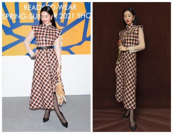 娇小的王子文穿了一件dior2020早秋系列的波点衬衫搭配同色系小格纹半身裙,非常适合小个子的短打look,非常显比例显精神。