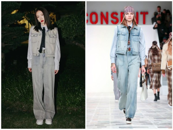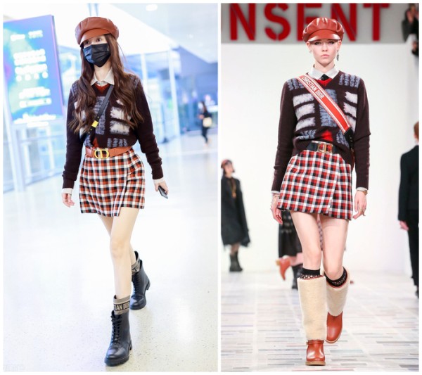 同样是学院风毛衣,diorT台上这套look会更适合张雪迎,年轻可爱又显比例,baby在机场穿过,效果也是不俗。