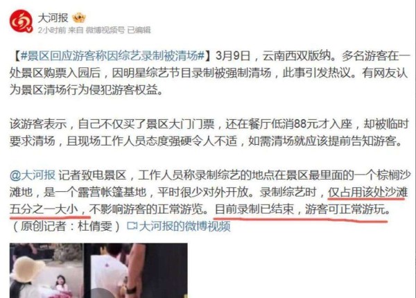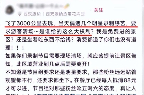 咖位不大架子不小!9个明星云南录节目,强制驱赶游客,态度嚣张曝明星云南录综艺驱赶游客!容祖儿9位大咖受牵连,景区最新回应怒不可遏!云南景区被综艺霸占,游客花钱被驱赶,明星冷眼旁观明星综艺云南驱赶游客:内娱特权乱象,谁给的底气?游客飞3000公里花钱去云南西双版纳一景区游玩,因明星录综艺被强制清场驱赶;景区回应:拍摄区未占营业范围,清场系剧组行为刘畊宏否认录节目强制清场子,真相究...@拾柒只的动态明星录制综艺节目驱赶游客? 游客:玩了没1小时 要求退票遭拒 广东千古情景区回应特别节目上线、直播连线、远程录制,“云录制”改造国产综艺业态明星录制节目,游客被阻拦公园外,特权背后谁在操控?蓝台综艺再次忽视明星安全,拍摄场地水位太高,节目组强行录制
