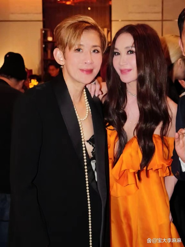 着装为黑色西装的造型呈现出干练并且大气的特质,其颈间用以作点缀的是一条珍珠长项链,如此这般刚柔并济,极其充分地展现出具有独立干练特性的女性风范,那种“大姐大”的气质被拉到满格状态。有两位风格方面存在迥异不同情况的女神处于同框情形之中,一位呈现出柔美的风格,另一位展现出飒爽的风格,二者所形成的视觉效果是非常令人惊艳的。