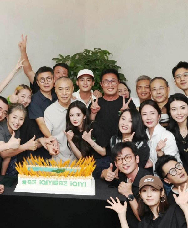 杨幂提着一个jellycat小猴包,牛仔裤让她显得腿长又好看。她一直站在拍照的中间位置,和导演刘家成一起切蛋糕。剧里的“兄妹”邢菲和赵达坐在前排,开心地比耶,欧豪则低调地站在边上,戴着一顶白帽子,脸上挂着阳光般的笑容。