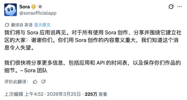 就在刚刚,Sora 官方也在 X 平台上发文告别: