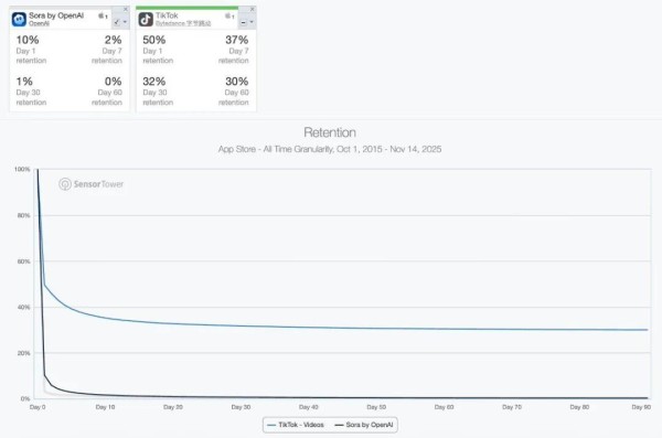Sora APP 的 30 天用户留存率仅为 1%,60 天留存率直接归零。