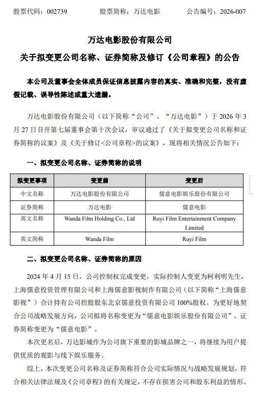 3月27日,万达电影发布拟更名公告,称为更好地契合公司战略发展方向,拟将名称变更为“儒意电影娱乐股份有限公司”,证券简称变更为“儒意电影”。更名后,万达影城作为公司旗下重要的影城品牌之一,将继续为用户提供优质的观影与线下娱乐服务。