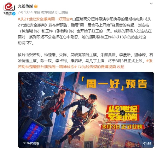 7月16日,光线传媒在投资者互动平台表示,公司参投、发行的影片《从21世纪安全撤离》将于8月3日上映;公司主投、发行的影片《她的小梨涡》将于8月10日上映,敬请期待。同时,公司尚有众多其他项目,将根据市场及审批情况安排合适的上映档期。猫眼娱乐为公司的参股公司,公司会对其利润相应确认投资收益。
