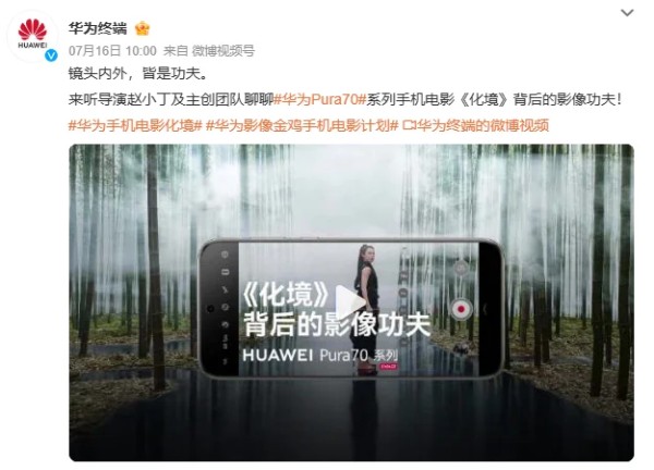 7月15日,华为首部功夫舞蹈手机电影《化境》上线华为终端,本片由知名导演赵小丁执导,全片由华为 Pura 70系列拍摄。电影《化境》将中国传统功夫与现代舞蹈巧妙结合,以竹林云雾喻迷境,以功夫舞蹈破迷局,演绎个体面临人生迷局时,从“入境”到“化境”的历程,展现击破迷局、锐意向前的精神。