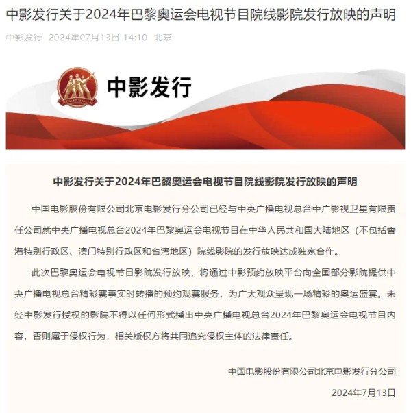 7月13日,中国电影股份有限公司北京电影发行分公司已经与中央广播电视总台中广影视卫星有限责任公司就中央广播电视总台2024年巴黎奥运会电视节目在中华人民共和国大陆地区(不包括香港特别行政区、澳门特别行政区和台湾地区)院线影院的发行放映达成独家合作。