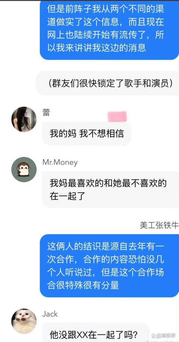 12月13日,多方网友曝双顶流恋情,一演员一歌手,而且之前网上也有过爆料。两人结缘是去年的一场合作,合作很特殊很有分量,后来女方参加节目男方还偷偷去看了,但当时没人多联想因为俩人画风太不搭了。今年女方多了好几个大的代言,且都是男方之前代言的品牌,其中有一个代言跟女方完全不搭。