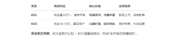 黄金组合策略:KOL造势打认知 + KOC铺量促转化,形成“金字塔式传播矩阵”。