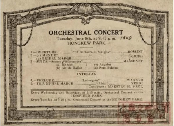 这张1926年6月8日虹口公园露天音乐会节目单,是现存最早的露天音乐会节目单。梅百器荣获李斯特国际钢琴比赛大奖后,1918年底抵沪举办钢琴独奏会。1919年,他担任上海公共乐队(后更名为上海工部局乐队)指挥,通过从欧洲招募优秀乐手、引入先进排练制度、拓展演出曲目等,将该乐队打造为蜚声海外的管弦乐团。梅百器坚持让中国人进入音乐会现场,打破了乐队只为外籍观众演奏的惯例。1926年6月8日21点15分,梅百器指挥上海工部局乐队在虹口公园演出,带来了罗西尼、瓦格纳等大师的作品,让交响乐走出殿堂。在票面上可以看到,每周四晚虹口公园都举行常态化公园音乐会。根据当时记载,最多一次观众达3500人,这也成为上海音乐消夏传统的起源。