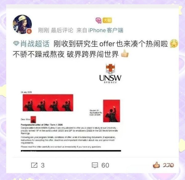 肖战,那个在超话里因录取通知书而刷屏的偶像,让我深切地体会到:追星的终点,原来在于自我追寻。今年夏日,肖战的超话社区焕然一新。这里不再充斥着精修的美图和打榜的链接,取而代之的是满屏的录取通知书——北大的、清华的、东京大学的,它们仿佛在诉说着一个个励志的故事。