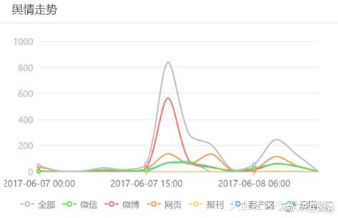 根据舆情走势图分析,该话题发端之后,迅速引发了舆论关注。舆情曲线接近直角上升,在6月7日晚6点达到峰值。随后,话题热度陡降探底,尽管在6月8日9时略有上升,但也难以维持热度,关注度衰竭,进入长尾阶段。