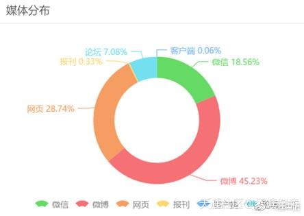 从媒体分布图分析,由于被关账号涉及平台较多,因此舆情信息来源占比也较为平均。其中,微博平台占比45.23%;网页新闻占比28.74%;微信公众号占比18.56%,此三类是主要的内容来源。