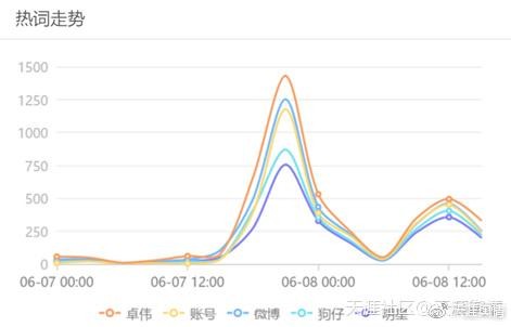 根据热词走势分析,涉及“卓伟”的内容数量级一直领先。各个热词都遵循整体舆情走势上下波动,并未出现数量级的明显变化。说明舆论认为“卓伟”及其工作室是这次治理行动的主要针对对象。