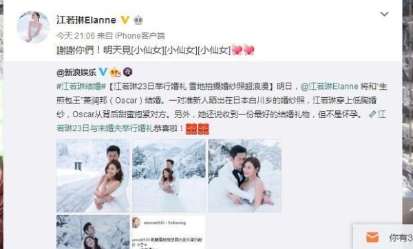江若琳发微博说:明日,@江若琳Elanne 将和“生煎包王”萧润邦(Oscar)结婚。一对准新人晒出在日本白川乡的婚纱照,江若琳穿上低胸婚纱,Oscar从背后甜蜜抱紧对方。另外,她还说收到一份最好的结婚礼物,但不是怀孕。