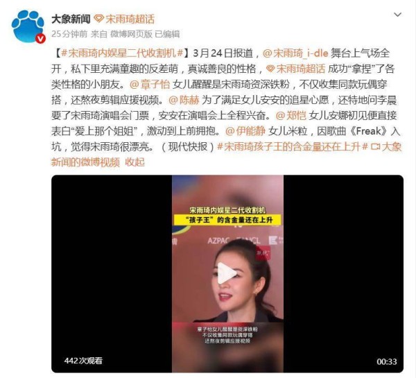 舞台上的宋雨琦,作为燃爆全场的女团I-DLE成员,闪耀着无数光芒;然而,舞台下,她又变成了让许多明星家长感到头疼的抢手人物——3月24日的报道中,宋雨琦被网友戏称为内娱星二代收割机,这个标签并非空穴来风。从章子怡到陈赫,再到郑恺与伊能静,这些明星大腕们的宝贝女儿,几乎都成了宋雨琦的忠实粉丝,每一个都对她充满了崇拜。