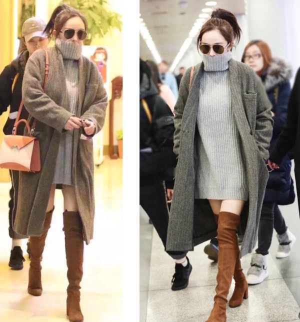 Lily觉得杨幂不仅是带货女王,更是时尚圈里最会穿的女星了,她的每一套穿搭我个人都觉得很有参考价值,就拿这一套大衣搭配来说,深灰色大衣+浅会高领针织连衣裙,利用了同色系的穿搭,轻轻松松就打造出高级感。下身再配上一双过膝紧身棕色靴子,一双吸人眼球的大长腿就出现了,将大衣敞开来穿,走路带风的感觉,高高扎起的马尾,显得她更精神利落。