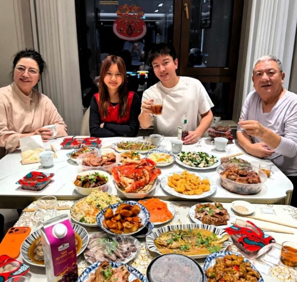 贾乃亮晒年夜饭全家福,东北家常菜超接地气,玻璃倒影意外曝光拍照人