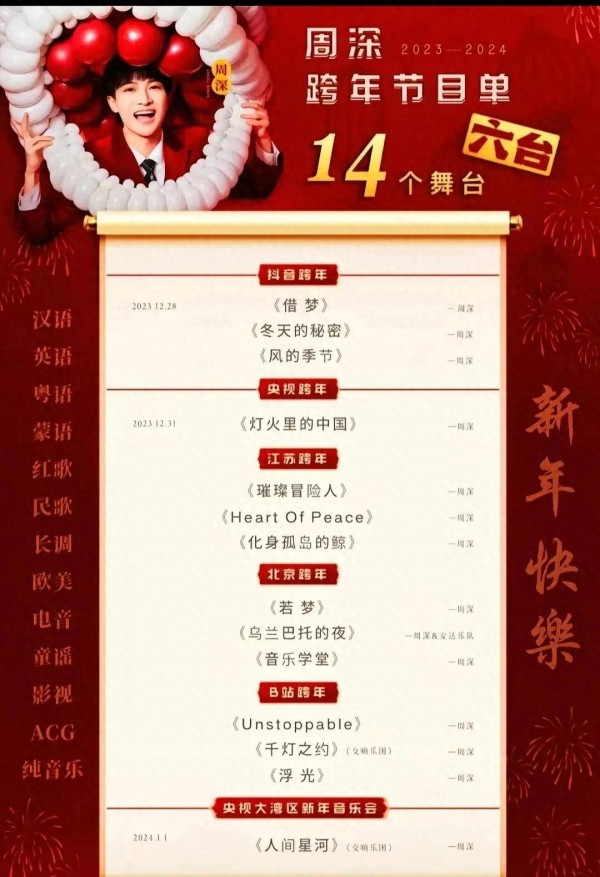 周深的跨年演出,让我们见证了他音乐才华的辉煌和实力的突破。他用音乐打破了时间和空间的限制,与观众们一起度过了难忘的跨年夜。在新的一年里,让我们一起期待周深更多精彩的音乐之旅,让他的歌声再次唤醒我们内心最柔软的部分。