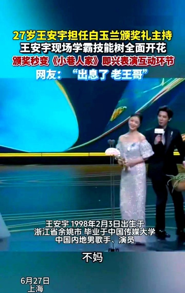 此外,在综艺节目《花儿与少年》中,杨天真并未为王安宇打造复杂的人设,而是让他自然展现真实的自我。王安宇阳光、积极、向上的形象因此深入人心,赢得了观众的广泛喜爱。而让王安宇担任白玉兰奖的主持人,无疑是杨天真的明智之举。这一安排不仅充分展现了他出色的播音专业能力,更让他在业界最顶尖的颁奖典礼上大展风采。中传播音系培养的语言组织能力、211学霸的思维敏捷度以及多年的表演经验所积累的镜头松弛感,在白玉兰的舞台上交织出绚烂的火花。当他与获奖者王安全互动时,那句“王安全你好,”不仅展现了他的从容与自信,更让观众看到了他作为主持人的魅力与风采。