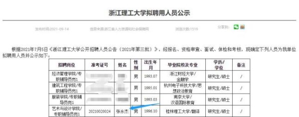 此前,据浙江省人力资源和社会保障厅发布的《浙江理工大学拟聘用人员公示》显示,1996年出生的张永杰被拟聘为该校艺术与设计学院专职辅导员。