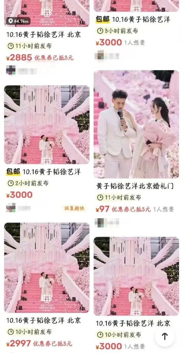 据报道,二手平台上出现了不少黄子韬徐艺洋婚礼黄牛票,产品宣传文案大多都提到可与艺人合影,可进婚礼现场,还有部分黄牛宣称现场有张艺兴、鹿晗、王俊凯等明星,但该信息并无官宣来源。
