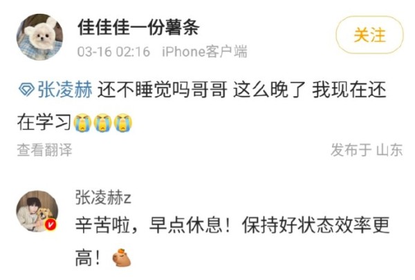 张凌赫多次强调“希望粉丝是独立个体,我只是他们生活的小部分”。这一理念贯穿实践:他鼓励粉丝专注自身生活,仅在对方失落时通过作品传递力量。例如回复高考生“高考加油”,或对失业粉丝给予安慰,始终将粉丝的成长置于追星之上。这种清醒的边界感,既避免情感绑架,也消解了偶像与粉丝间的权力不对等,为内娱提供了“去依附化”的范本——明星不必成为粉丝的精神寄托,而是共同成长的同行者。