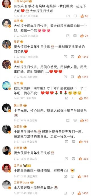 何炅称节目为“人生最重要的十年”,吴昕喻其“成年人社交范本”,戚薇强调“爱大侦探宇宙里的每一个我”。魏晨再现名台词“我确实没有不在场证明”,魏大勋以“跨物种主理人”串联角色宇宙。