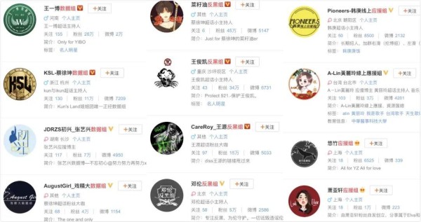 微博输入关键词数据组、反黑组、应援组后出现的信息页↑