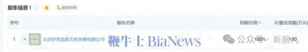 进一步股权穿透看到,这家上海瑆璨文化传媒有限公司为北京好奇易星文化传媒有限公司全资持股。