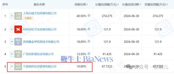 在杭州炳午影视传媒有限公司中,宁波明侨投资管理有限公司持股10%。
