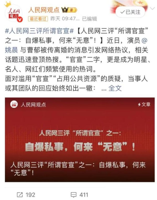 “官宣”被滥用,人民网痛批!姚晨该背这锅吗