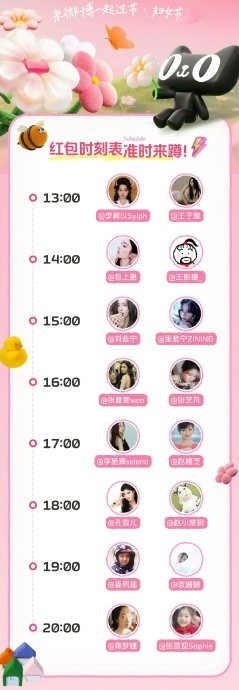 本次妇女节红包活动采用“13:00–20:00整点明星双人组接力”形式,每轮两位明星同步发放红包。如15:00档由刘些宁与张紫宁搭档,16:00档张紫宁再度携手张艺凡返场。这种紧凑排期导致用户需在短时间内集中火力争夺两位顶流红包,抢购压力倍增。