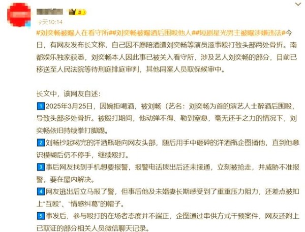 这里出现了诸多疑问:究竟发生了何事?据传闻,在今年三月,刘奕畅与几位圈内人士共聚一堂。期间,有人提议让一位网红陪同饮酒,然而对方却婉言谢绝。或许是因为酒精的作用和情绪的激动,刘奕畅感到自己的尊严受到了挑战,于是做出了冲动的举动。在酒瓶砸落的瞬间,场面彻底失控。爆料者头部遭受重创,头骨骨折,现场秩序混乱不堪。